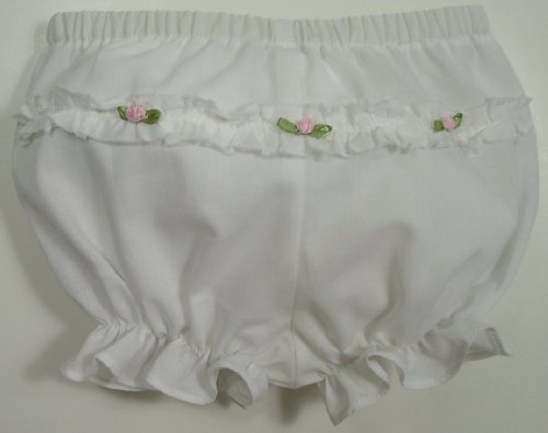 Our darling "Take Home" Bloomers in white cotton batiste are so sweet for your new baby girl! Accented with a sweet ruffle and tiny pink rosebuds on the bottom, they match our white "Take Home" Dress and Bloomers, also sold in our store. So sweet for baby coming home or for her Christening. Designed by Liz MacIntyre for My Baby's Closet. Machine washable and made in USA.