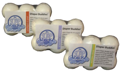 Diaper Buddies can be used to deodorize your diaper pail, and they can be used as laundry boosters. One diaper buddy is enough for a regular pail but you may need two for a large pail. When you are ready to wash, just dump the Diaper Buddies into the machine along with the clothes and it will act as a laundry booster. Laundry detergent should still be used but other additives are not necessary. These come to you shrinkwrapped in groups of six inside a resealable bag for maximum freshness. Just add a Diaper Buddy to your clean pail before you put the dirty diapers in. The ball will act to absorb odors and add a fresh scent to your pail. When it is time to wash your diapers you throw it into the washing machine with your diapers and it works as a laundry booster for cleaner diapers.