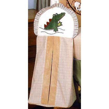 The Zanzibar Nursery Diaper Stacker features an aligator design element with plaid accenting in shades of brown, green and cream.