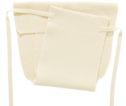 This organic cotton tie cloth diaper is comprised of a very long piece of stretchy knit cotton that is wrapped and tied around your baby. The concept is similar to a flat or prefold in that it consists of one flat piece of organic cotton, but it also features a stretchy knit cotton tie that is wrapped around your baby's waist to keep the diaper in place. This diaper is made from soft, stretchy organic knit cotton that "grows" with your baby, which makes it truly a one-size diaper. It is one of the most economical choices in cloth diapers because it will fit your baby from birth through potty training. The knit cotton is absorbent but is fairly thin, so we recommend using this diaper with a doubler for extra containment and absorbency.This diaper may seem rather intimidating at first, but with a bit of practice you will find that it is quite easy to use without the need for any snaps, velcro, fasteners, or pins. Once you have mastered this tie and have achieved a snug fit, we do recommend folding the fabric in (toward your baby's skin) once or twice around each leg to form a cuff; this will help contain leaks. We love this diaper because it is one of few cloth diapers that is absolutely, 100% organic. Because it has no elastic, velcro, or snaps, it truly contains no synthetic materials of any kind. You will need a cover with this diaper to make it waterproof.Size: This is a one-size diaper. Unfolded, the dimensions are: 49.5" long (from top to bottom), 7" wide (at the narrow base), and 11" wide (at the wide upper portion). Each string is 22" long. Care: This diaper is machine washable and may be dried on medium heat. Organic cotton absorbs moisture well, but keep please keep in mind that it should be washed 5-10 times before reaching its full absorbency. If you skip this important step, you will find that liquid rolls right off of the fabric. This is due to the natural oils found in organic, unbleached cotton.