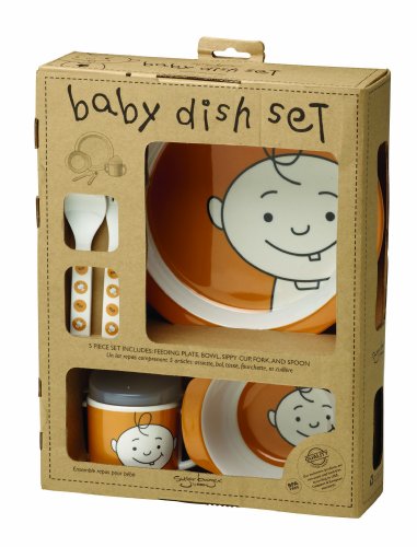 The pattern that started it all, the iconic SugarBooger baby five-piece feeding set in contemporary colors and matching sleeved bib (sold separately) is great for mealtime, art projects or chef's little helper. Set includes plate, sippy cup, bowl, fork and spoon in attractive see-through gift box packaging. Plate measures 0.75" high by 8.5" diameter. Bowl measures 2" high by 4.5" diameter and holds 20 ounces. Fork and spoon measure 5.5" x 1". BPA-free, dishwasher safe. Hand wash for best results. Do not microwave. Melamine looks like ceramic, but at a lighter weight. It's also more durable, but not unbreakable. Non-toxic and lead-free according to US, European, and Canadian standards.