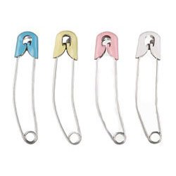 Introducing our Heavy Duty Curved Baby-Safe Diaper Pin. These pins feature a brass head that pulls up to open and locks down to close. The locking feature makes this pin the number one choice for pinning cloth diapers. A curved design glides through the diapers for easy pinning. Made in the U.K. and available in four colors (yellow, white, blue, pink), the pins are sold 1 pair per package (each pin is approximately 2-1/8" long).