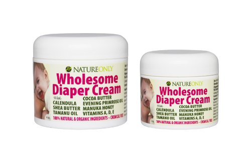 Nature Only Wholesome Diaper Cream is comprised of only the finest 100% natural and organic healing ingredients, with anti-inflammatory and skin regenerating properties, fine oils, antioxidants and vitamins. It is calming, soothing, moisturizing, and naturally healing.Our Wholesome Diaper Cream is remarkably effective in healing and preventing the Diaper Rash, one of the most common and discomforting conditions that most babies experience.Perfect for even the most sensitive baby skin; it contains the purest and safest ingredients possible, such as Calendula, Shea Butter, Cocoa Butter, Manuka Honey, Evening Primrose Oil, Tamanu Oil, Vitamins A, D, and E, French Lavender Essential Oil and other 100% natural healing ingredients. Nature Only Wholesome Diaper Cream does NOT contain Parabens, Petroleum Products, Zinc Oxide, Steroids, Lanolin or any other Animal Products. NO Preservatives, Artificial Colors or Fragrances added. It is CHEMICAL FREE and Hypoallergenic. Not tested on Animals. Even the Jar is Bisphenol A (BPA) free.It is advisable that products which contain steroids and synthetic harsh chemicals should be avoided(unless medically necessary) because they can be absorbed into the bloodstream and can lead to undesirable side-effects.